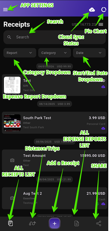 Please see the diagram below that points out the navigation of the Smart Receipts app.