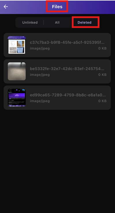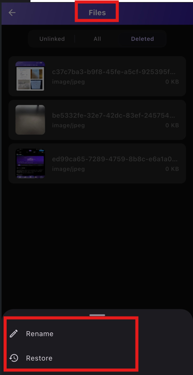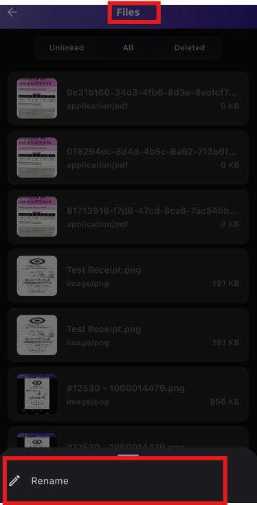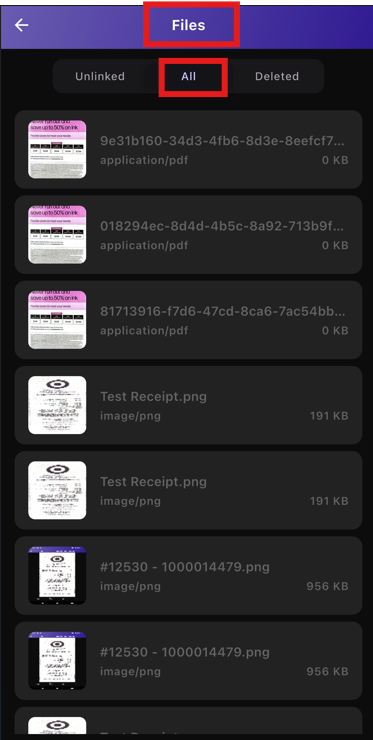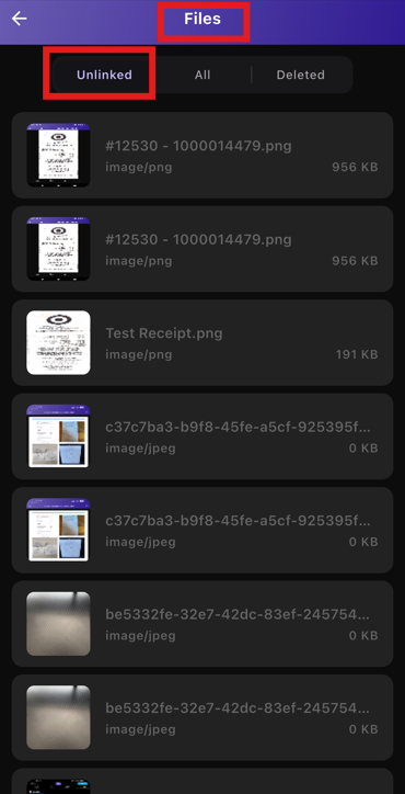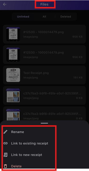 Tap the file you wish to link to an existing receipt or create a new receipt.